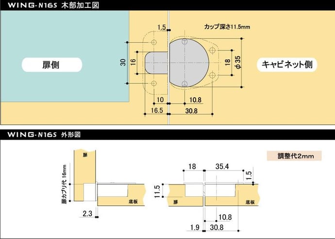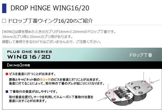 今回のオススメ商品は、ライズ社製品 WINGドロップ蝶番をご紹介致します。この商品の最大の特徴は、何と言っても、底板に対して、20mmカブセる事が出来る所に有ります。