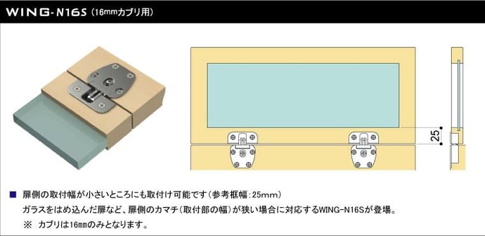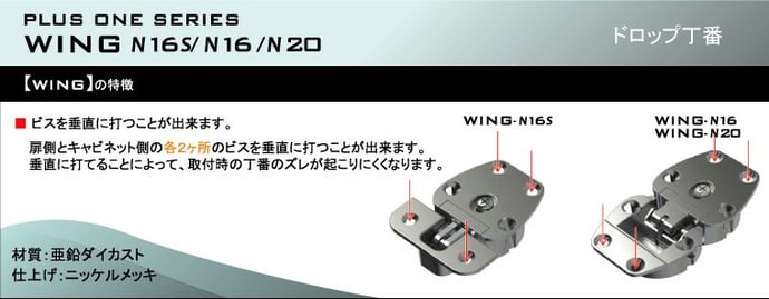 他にも、今流行りの、取付幅が狭い、木枠のガラス扉等に使用出来るタイプのドロップ蝶番(16mmカブセ)もございます。いずれも、ニッケルメッキを施しており、あらゆる家具にもマッチし、見た目も映えます。是非、一度お試し頂ければと思います。