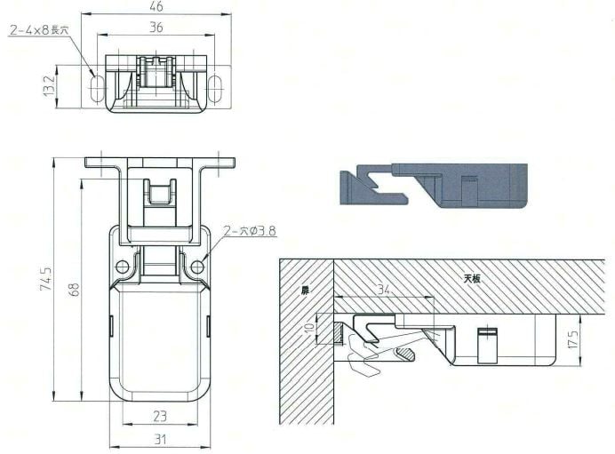 ⑤本体が水平状態から傾きますと、ツノが降り、受けに引っ掛かります。