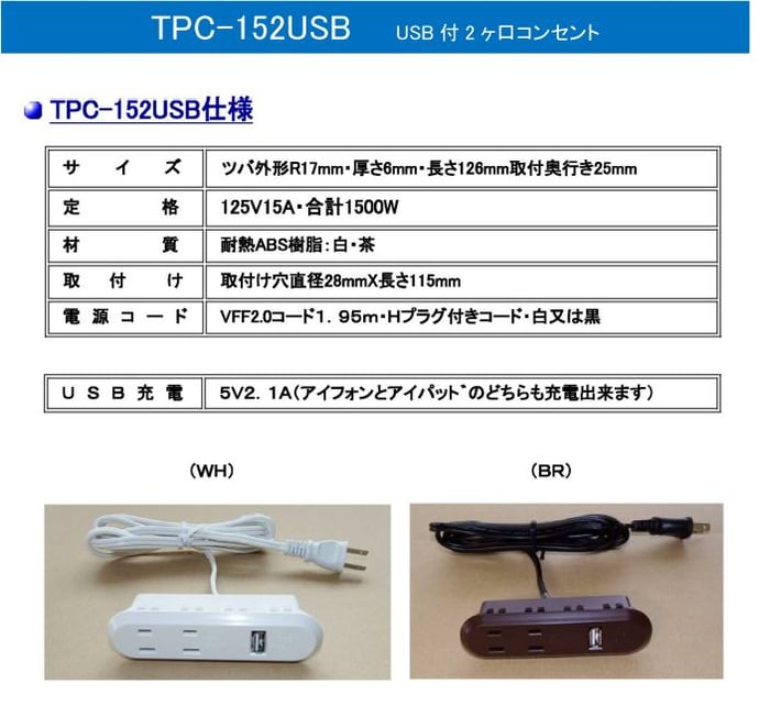 今回は、テクノパーツ社 USB付コンセントのご紹介です。現在、弊社の販売は、ノーマルの2口コンセントが主流ですが、近年の、スマホやノートパソコンの普及により、USB付コンセントの需要も高まっているようです。こちらの家具コンセントは、プラグ付ですので、面倒な工事も必要無く、ただ什器に穴をあけて、押し込むだけで取付は完了です。色は、白と茶の2種類です。今後は、このタイプが出てくると思われますので、機会が有れば、是非一度、お試し下さい。