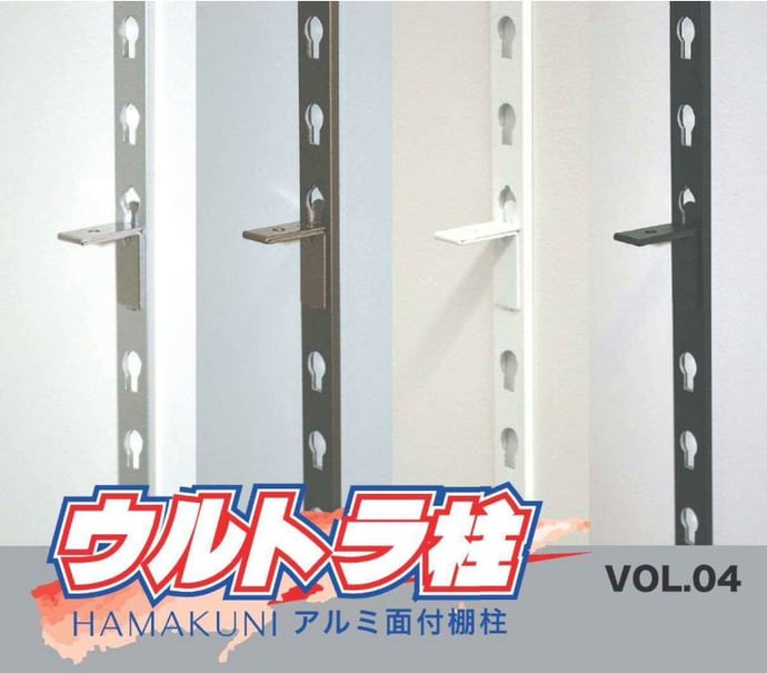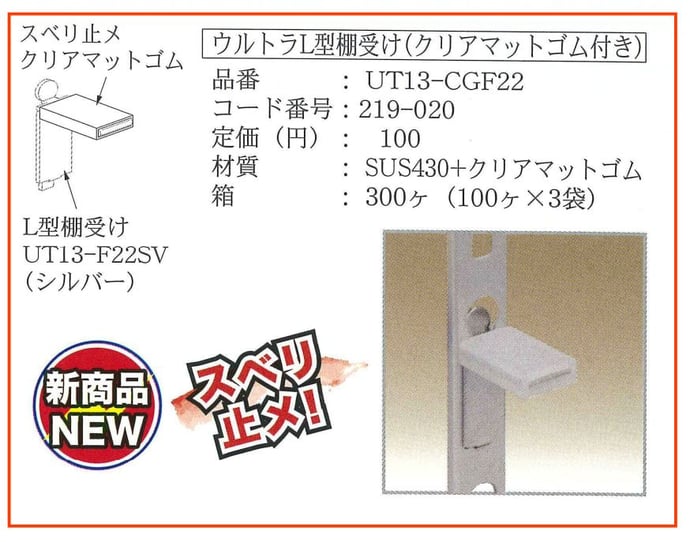今回は、第13回のオススメ商品としまして、イーグル ウルトラ柱用スベリ止棚受をご紹介致します。この商品は、今年1月に発売されたばかりの物で、名前の通り、棚ズレを防止する目的の物です。(赤枠で囲んだ物がそれになります。)今までは、このシリーズのL型棚受に対するゴム付棚受が無かった為、棚ズレを防止する為には、木棚板に切り欠きをする必要が有りました。しかし、これが登場したことにより、木棚板への切り欠きは不要となりました。それにより、施工者様の作業時間の短縮が実現されました。また、他社製品と比べましても、グリップ性が優れており、使い勝手が良いのが特徴です。他にも、ラインナップが有りますので、是非お使い頂ければと思います。