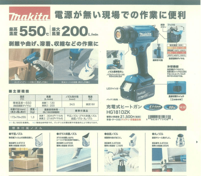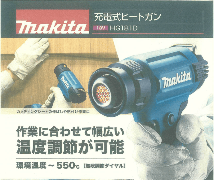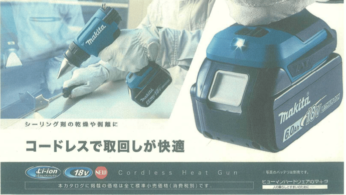 今回は第22回目のオススメ商品としまして、マキタ社の充電式ヒートガンをご紹介致します。従来品は、100Vの電源コードを使用しなければいけませんでしたが、この商品は、利便性の良いバッテリタイプとなります。バッテリタイプとなる事で、現場等場所を選ばず、どこでも使用可能です。また様々な用途に合わせて、温度調整も可能です。現状、温める為に、ドライヤーや、スチームアイロン、ヒーター等を使用される方も多いと思いますが、今後はコチラの商品へと切り替えてみてはいかがでしょうか。是非、弊社までお問い合わせ下さい。